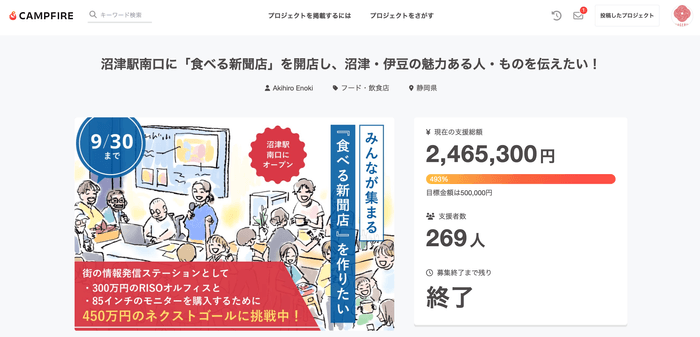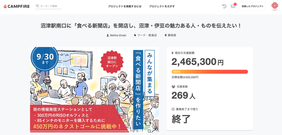 「ツナゲル」はインターネット新聞「沼津経済新聞」を運営し、編集事務所「NewStand+」を整備するために、2024年8月に自社プロジェクトとして「沼津駅南口に『食べる新聞店』を開店し、沼津・伊豆の魅力ある人・ものを伝えたい!」をCAMPFIREで実施いたしました。