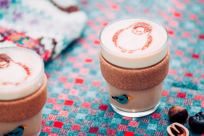隣接するカフェでは、コーヒーやココアなどのホットドリンクを販売します。特におすすめしたいのは、ココアパウダーで森の野鳥を描いたカフェラテです。絵柄は4種類で、いずれもリンク周辺でよく見かける野鳥です。