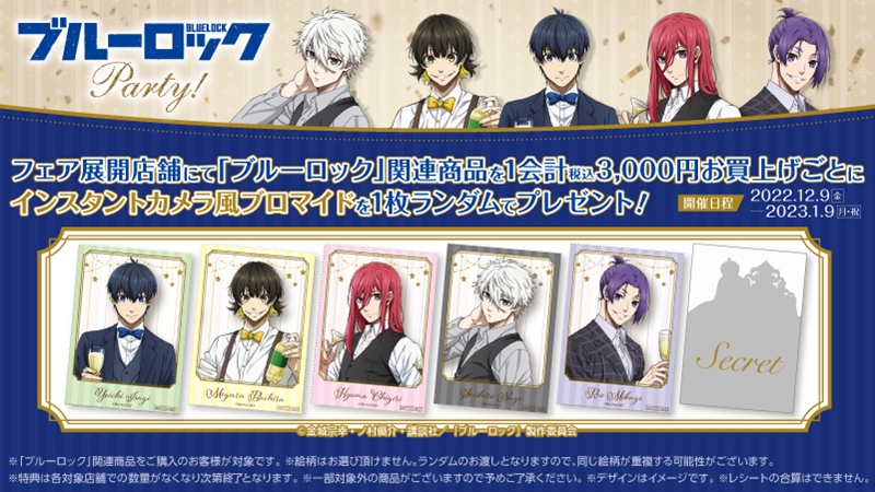 フェア展開店舗「ブルーロック」関連商品を1会計税込3,000円お買い上げごとにインスタントカメラ風ブロマイドを1枚ランダムでプレゼントいたします。