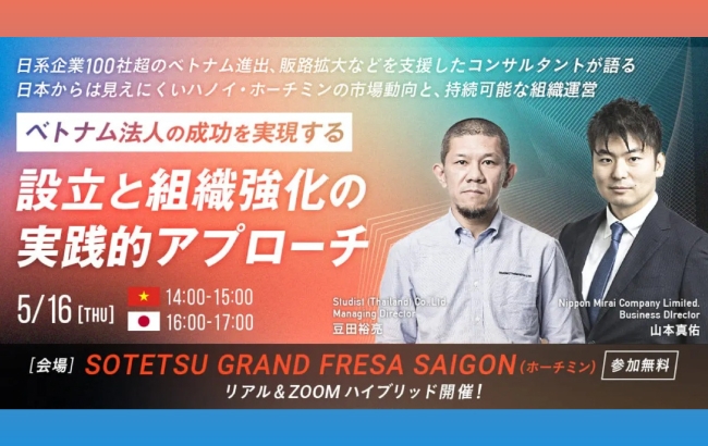 みらいコンサルティンググループ(本社:東京都中央区、代表:久保 光雄 岡⽥ 烈司)は、セミナー「ベトナム法人の成功を実現する、設立と組織強化の実践的アプローチ」を2024年5月16日にベトナム会場とオンラインで同時開催いたします。