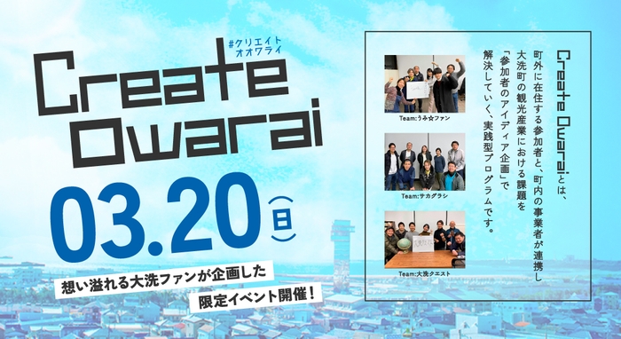 大洗観光おもてなし推進協議会(茨城県東茨城郡大洗町)は、大洗町の観光産業における地域課題の解決と観光産業の担い手を育成していくための実践型プログラム「Create Owarai ~遊び創りワークショップ~」の参加者が企画した限定イベントを、2022年3月20日(日)に開催いたします。