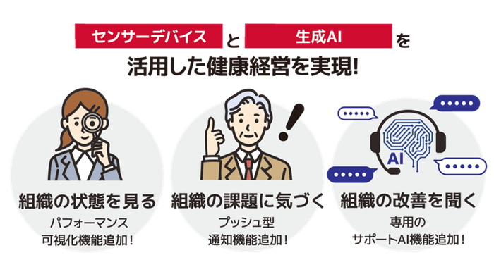「健康経営支援サービス」のリング型またはリストバンド型のセンサーデバイスにより収集したバイタルデータと、最新の生成AIを組み合わせ、可視化された組織と個人の心的状態の課題に対して最適な解決策・打ち手を提供します。