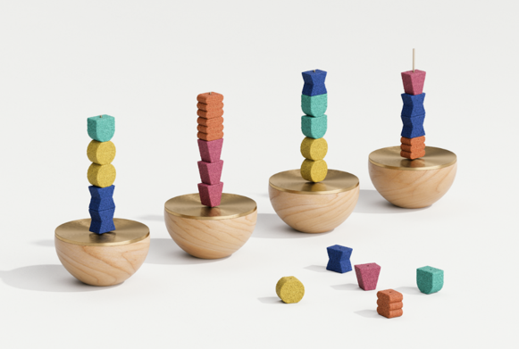 「トキヲクム」は、お香の燃焼によって「時間の移ろい」を視覚と嗅覚で感じるお香時計です。慌ただしく過ぎゆく日常の中で自分のリズムを取り戻してほしいという思いから生まれました。最大の特長は、香りや色が異なるお香のブロックを積み上げ、これから過ごす自分だけの時間を「プログラム」できる点にあります。「POSITIVE」「RELUX」「REFLESH」「SATISFY」「FORCUS」と名付けられた全5種の異なるお香を積み上げる行為そのものが自分の内面を見つめるきっかけとなり、香りの変化によって時間の経過を感じることができます。