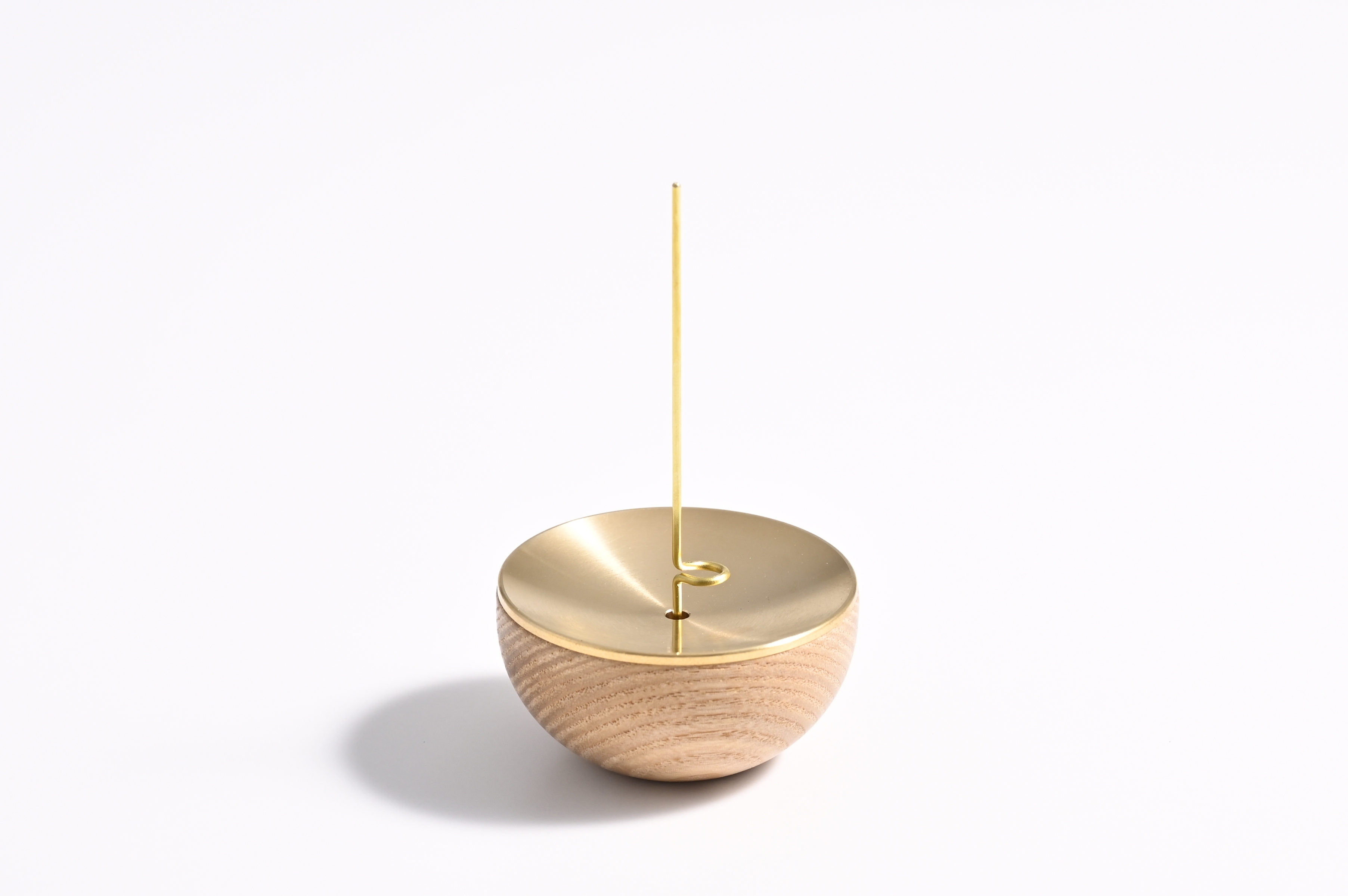 温かみのある木製のベースに真ちゅう製の受け皿を重ねることで、1つの調度品のような佇まいを目指しました。中央に向かって緩やかな傾斜を持つ金属パーツが、燃え落ちる灰を美しく受け止めます。異素材が調和するミニマルなデザインは、どのような空間にも静かに馴染みます。