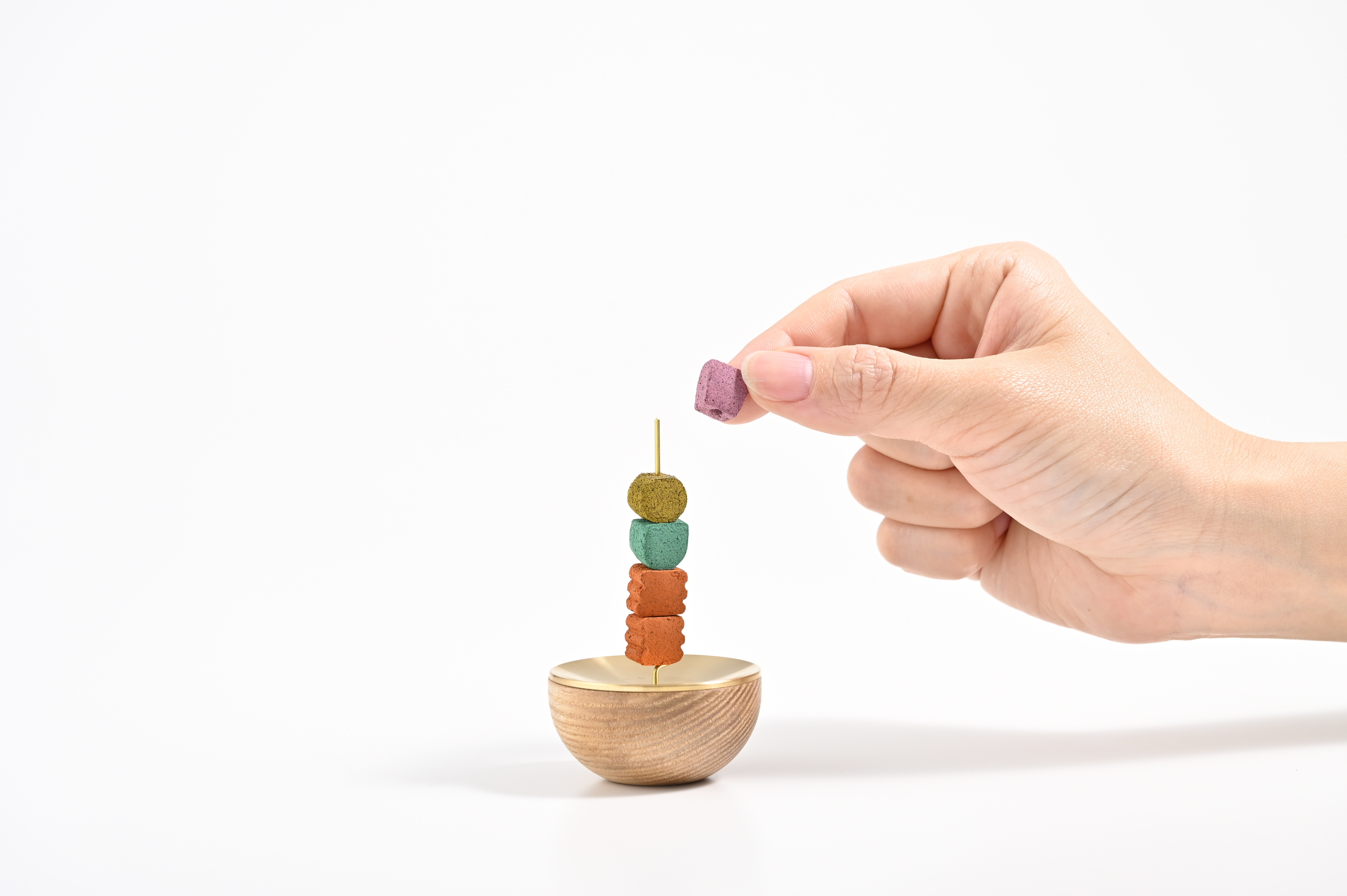 「トキヲクム」は、コクヨデザインアワード2022にて優秀賞を受賞したデザイナーユニットmrkの作品をもとに、松栄堂が培ってきた薫香づくりの技術を活かして製品化したものです。300余年にわたり香づくりに携わってきた当社の調合・成型技術により、お香ブロックの繊細な形状や、時間の経過とともに変化する香りの切り替わりを実現しました。