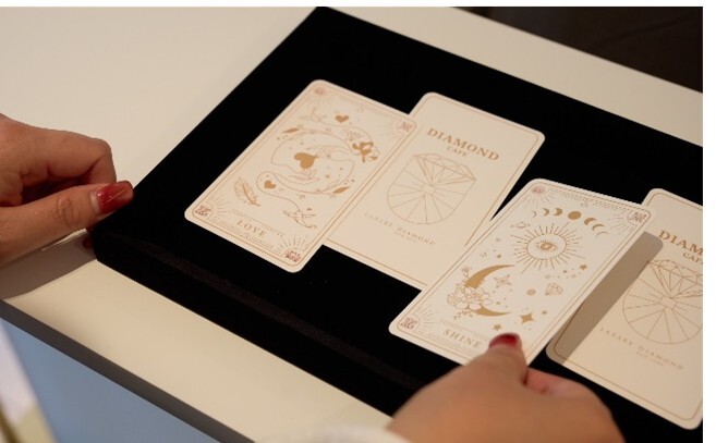 2階のジュエリーコンシェルジュデスクでは、運命のダイヤモンドジュエリーを導き出すオリジナルタロット体験をお楽しみいただけます。あわせて、ダイヤモンドの魅力や歴史、ジュエリー選びに関するご相談も承ります。3階では、カフェに立ち寄るような感覚で、ジュエリーの試着体験を気軽にお楽しみいただけます。ご試着いただいた方には、ダイヤモンドジュエリーとの特別な瞬間を収めたチェキを、オリジナル台紙に入れてプレゼントいたします。