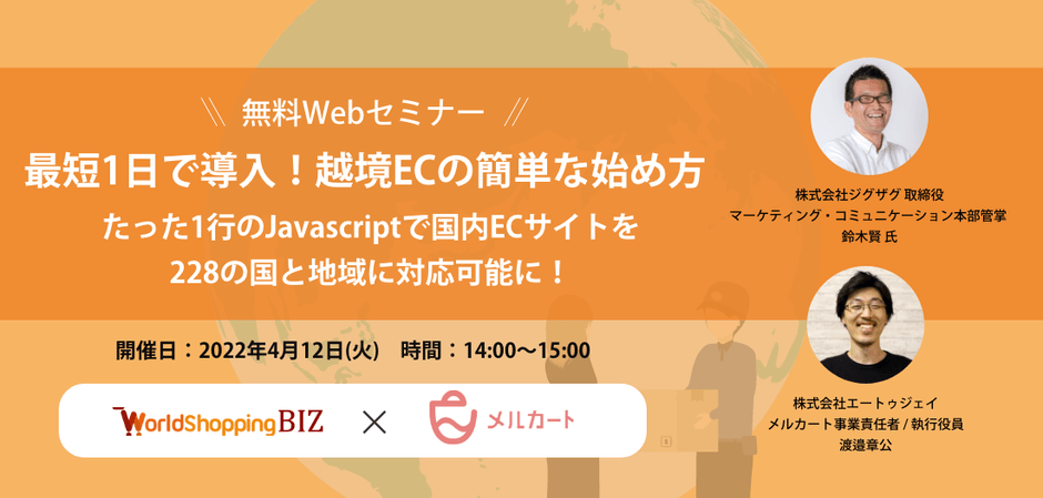 ウェブインバウンド・越境EC支援を行う株式会社ジグザグ(本社:東京都渋谷区、代表取締役:仲里一義)は、株式会社エートゥジェイ(本社:東京都港区、代表取締役社長:飯澤満育、以下 エートゥジェイ)の運営する売れ続ける仕組みが作れるネットショップECサイト構築サービス「メルカート」と連携を開始しました。また、この度の連携開始に伴って「ECサイト運営・越境EC」をテーマに2022年4月12日に共同ウェビナーを開催いたします。