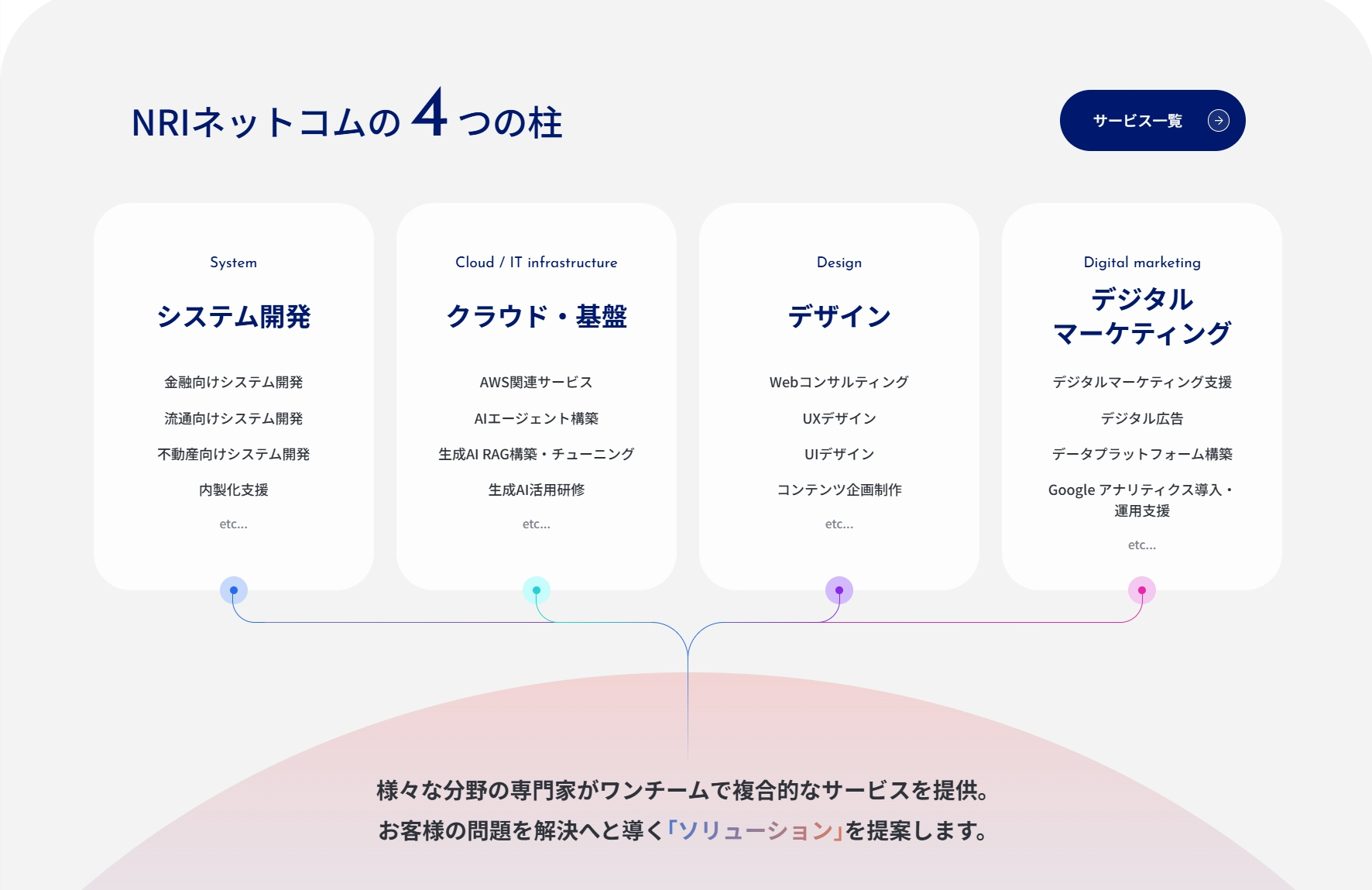 当社の大きな特長である4つの事業(システム開発、クラウド・基盤、デザイン、デジタルマーケティング)の専門チームが連携し、プロジェクトの構想段階から実装・運用までご支援できることを明示しました。