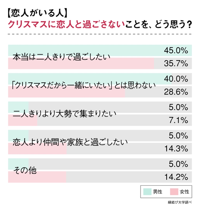 恋人がいても、クリスマスを二人きりで過ごす必要性を感じていない人も一定数いることが分かります。