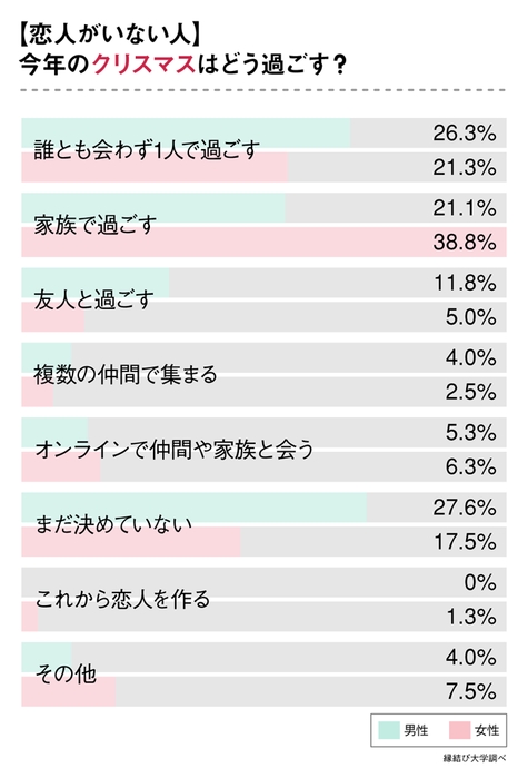 反対に「恋人とは会わず一人で過ごす」「恋人とは会わず家族で過ごす」「恋人とは会わず仲間と集まる」など、“恋人には会わない”と決めている人は、男性で12.3%、女性で19.7%となっています。