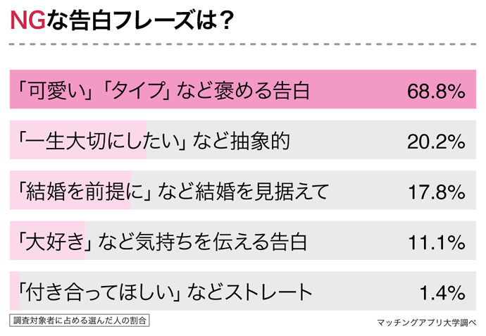 理想の告白フレーズだけでなく「NGな告白のセリフ」についても聞いてみました。その結果、1位は「”可愛い””タイプ”など褒める告白(68.8%)」、2位は「”一生大切にしたい”など抽象的 (20.2%)」、3位は「”結婚を前提に”など結婚を見据えた告白(17.8%)」でした。