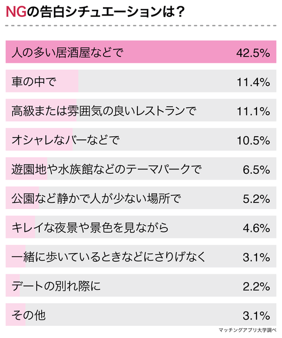 「NGの告白場所・シチュエーションは?」と聞いたところ、1位は「人の多い居酒屋などで(42.5%)」でした。2〜4位はそれぞれ10%前後で「車の中で(11.4%)」「高級または雰囲気の良いレストランで(11.1%)」「オシャレなバーなどで(10.5%)」と続きました。