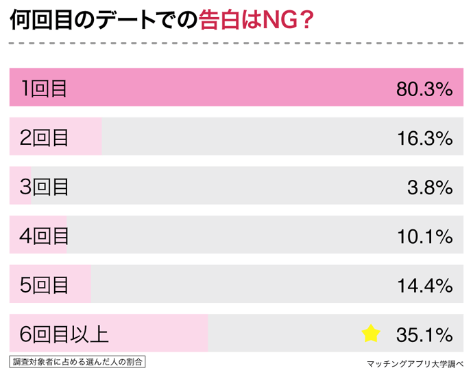 「何回目のデートでの告白はNGですか?」と聞いたところ、「1回目」と回答した女性は80.3%に上りました。2位は「6回目以上」で35.1%です。逆に「3回目」に関しては3.8%と極端に低い結果となっています。