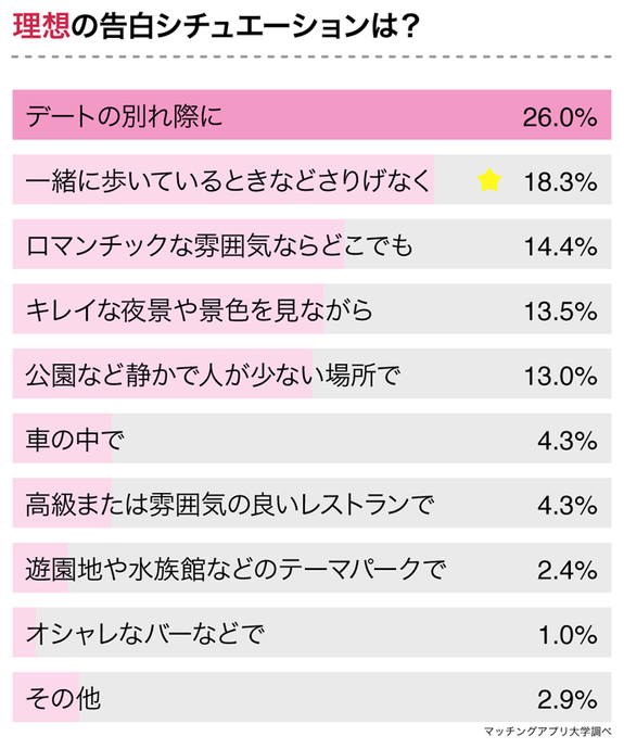 また10%以上の人が選択したのは、2位の「一緒に歩いているときなどさりげなく(18.3%)」、3位の「ロマンチックな雰囲気ならどこでも(14.4%)」、「公園など静かで人が少ない場所で(13%)」です。その他の告白場所・シチュエーションは5%を下回る結果で、好みが分かれる結果となりました。