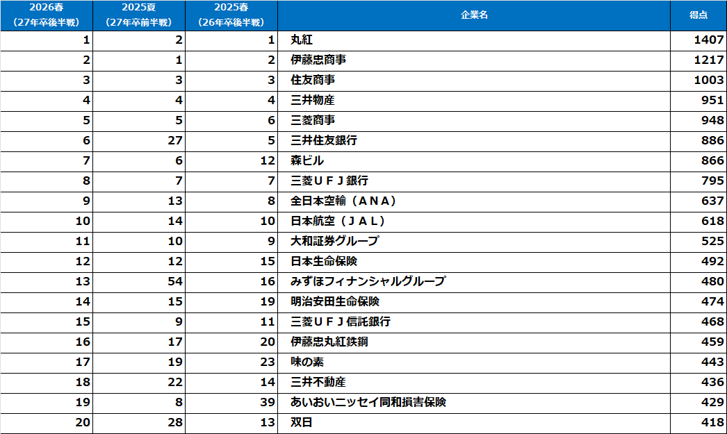 伊藤忠商事が7年連続で後半戦調査1位となったほか、丸紅(2位)、三井物産(3位)、住友商事(4位)、三菱商事(5位)と総合商社がトップ5を独占しました。