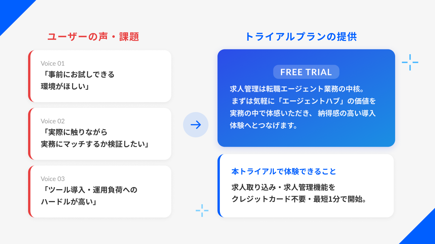 こうしたお声を受け、導入前の検討プロセスをより安心かつスムーズに進めていただくことを目的に、トライアルプランの提供を開始しました。本トライアルでは、「エージェントハブ」の数多くある機能のうち、特にご高評をいただいている求人管理の機能をお試しいただけます。