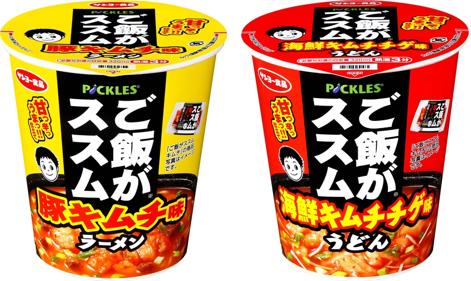 当社の売れ筋商品「ご飯がススムキムチ」と「サッポロ一番」でお馴染みのサンヨー食品株式会社とのコラボレーション商品です。商品の製造・販売に関しては、サンヨー食品株式会社が行います。ご飯がススムキムチの特長である「りんごの甘み、かつお節などの魚介の旨み」をベースに、ガーリックやごま油のコクを加えた豚キムチスープに仕立てた「豚キムチ味ラーメン」と、アサリ、イカの魚介のうまみにガーリックでコクを出したチゲスープに仕立てた「海鮮キムチ味うどん」の2品を、手軽な縦型カップ麺で発売します。