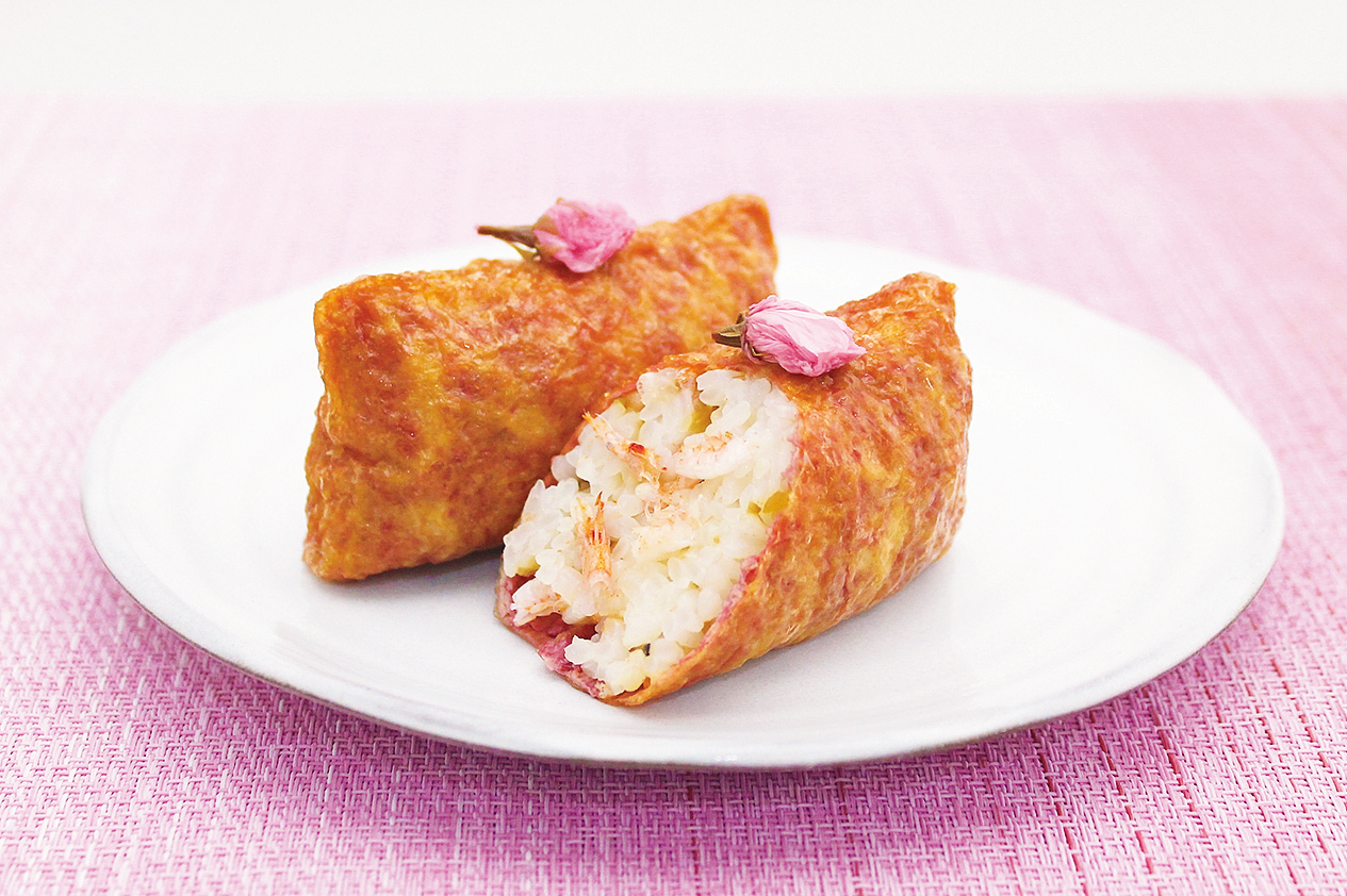 桜えび、しいたけ、かんぴょうを混ぜた酢飯をピンクのおあげで包み、桜の花をのせたいなりすし。
