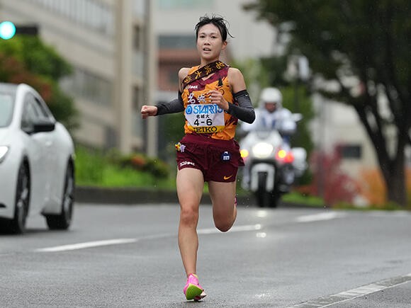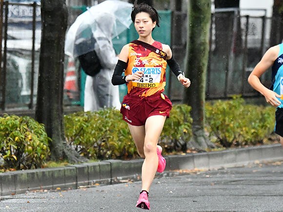 ワールドユニバーシティゲームズのハーフマラソン銀メダルの土屋舞琴選手(立命館大4年)の追い上げを受け、一時は逆転を許した場面もあったが、中継所までに再度前に出て4位で最後のランナーへタスキをつないだ。橋本選手の個人成績は30分21秒の区間5位。