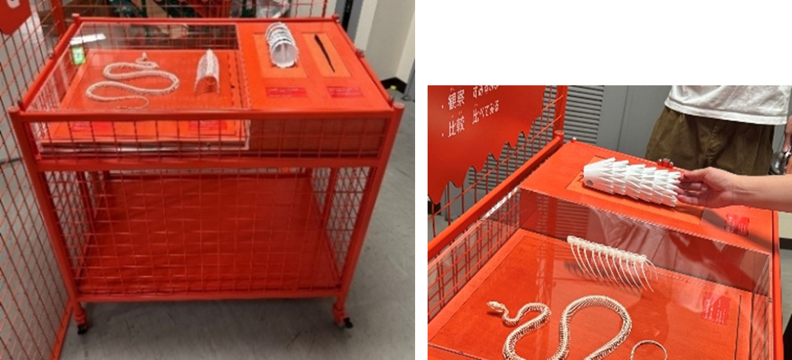 この動態展示は、2025年の正月に東博で動くヘビとしてお披露目したものですが、その後、解説パネル、ヘビの骨格標本や模型、自在の仕組みを拡大したモデル、そして実際のヘビの動きについて動画解説を追加していき、このたびついに貸出用の展示キットとして完成。自在蛇置物の構造が分かるように、手に取って体験いただけるハンズオンもついています。