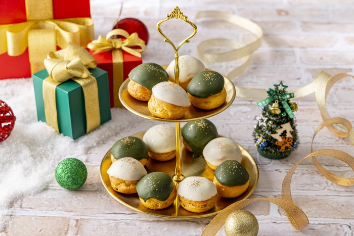 雪のような白色はカスタード、モミの木のような緑色は抹茶カスタードを入れて2つの味わいが楽しめるシュークリームに。振りかけた金紛でキラキラ輝く優美なデザインに仕上げました。