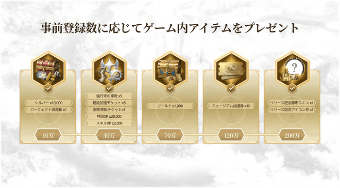 事前登録者が200万人を突破したことに伴い、英傑の採用などに使えるゴールドをはじめ、計11種類のゲーム内アイテムがリリース開始に合わせて全プレイヤーにプレゼントします。