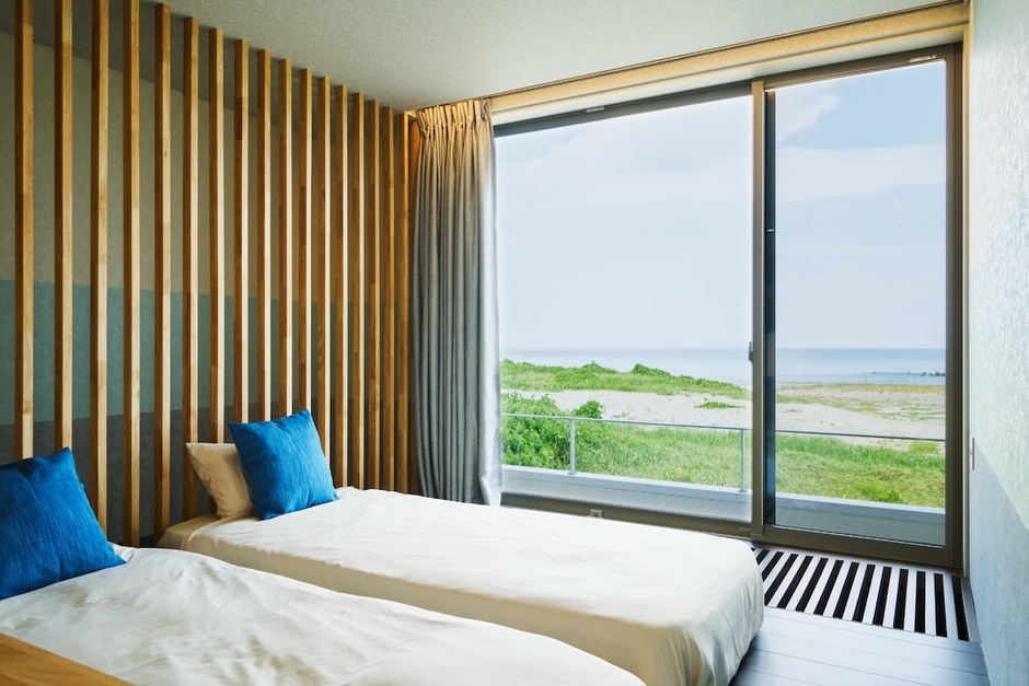 最大の特徴は、寝室の心身を癒す、プレミアムな寝心地のマットレスを使用したツインベッドから一望できる壮大な水平線と静かな港町。
