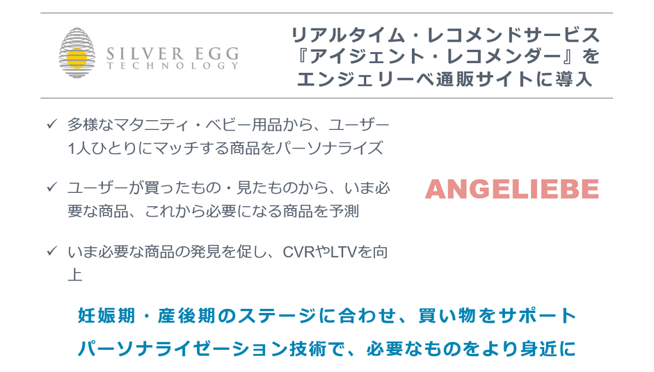 シルバーエッグ・テクノロジー株式会社(本社:大阪府吹田市、代表取締役社長&CEO:トーマス・フォーリー、東証マザーズ:3961、以下 シルバーエッグ)は、同社が開発・提供するAI技術を用いたレコメンドサービス「アイジェント・レコメンダー」を、株式会社エンジェリーベ(本社:東京都新宿区、代表取締役会長兼社長:岩本 眞二、以下 エンジェリーベ)の公式通販サイト( https://www.angeliebe.co.jp/ )に導入しました。