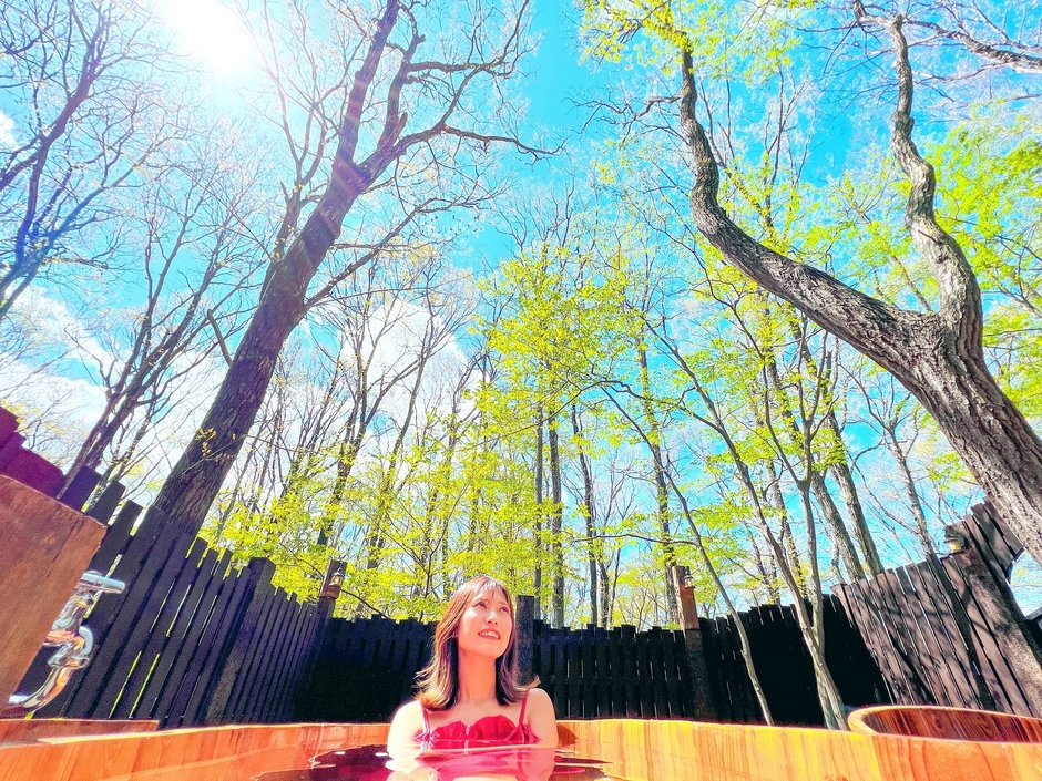 全面目隠しで囲われているので、外からは見えずプライベート感いっぱい。視線を気にせず楽しめます。カップルで、家族で、グループで完全貸切の露天風呂を満喫。昼の森林ビューは青空と緑が生き生きしていて気持ちが良く、夜のライトアップされた森も素晴らしく美しいです。
