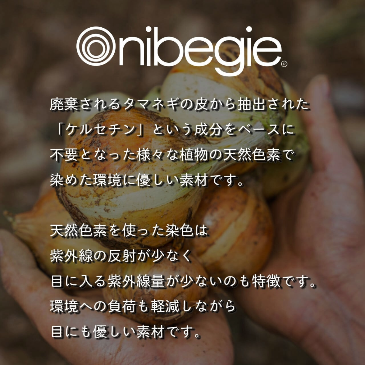 廃棄される国産タマネギの皮から抽出した天然成分をベースに、不要となった様々な植物の天然色素を組み合わせて生地を染色。捨てるものを再利用することで廃棄物を減らし、天然色素を使用することで環境への負荷も軽減しています。天然色素で染めた生地は明度が下がり、目に入る紫外線も減少させるという優れた機能も持ち、目に優しい素材です。