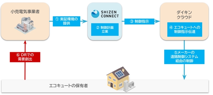VPP(*1)プラットフォーム開発会社の株式会社Shizen Connect(以下、Shizen Connect)と空調総合メーカーのダイキン工業株式会社(以下、ダイキン)は、再生可能エネルギー(以下、再エネ)の有効活用を目的に電力需要を創出するディマンド・リスポンス(以下、需要創出DR)(*2)において、家庭用ヒートポンプ給湯機エコキュートの沸き上げ時間を、再エネの発電量が多い時間帯にシフトする有効性を検証する実証実験(以下、本実証)に共同で取り組みます。本実証は、東北電力株式会社、北陸電力株式会社、北海道電力株式会社、四国電力グループの株式会社四国総合研究所とともに、2024年10月より開始します。