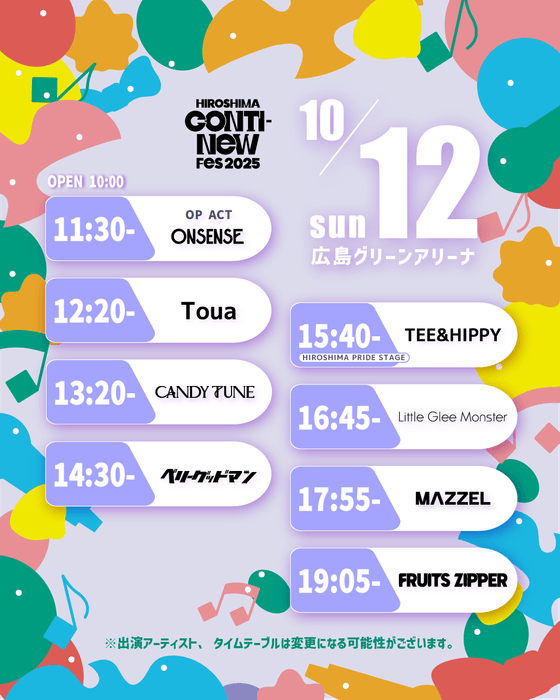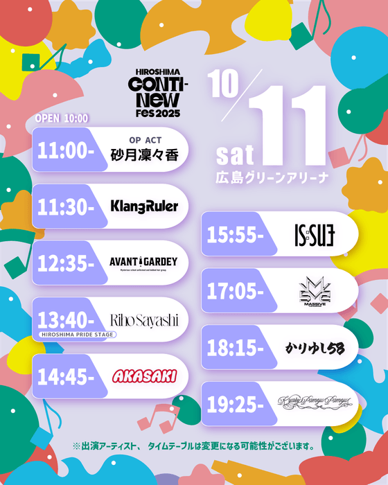 「HIROSHIMA CONTI-NeW FeS 2025」アリーナ音楽ライブ第4弾出演者&タイムテーブル&MC発表!