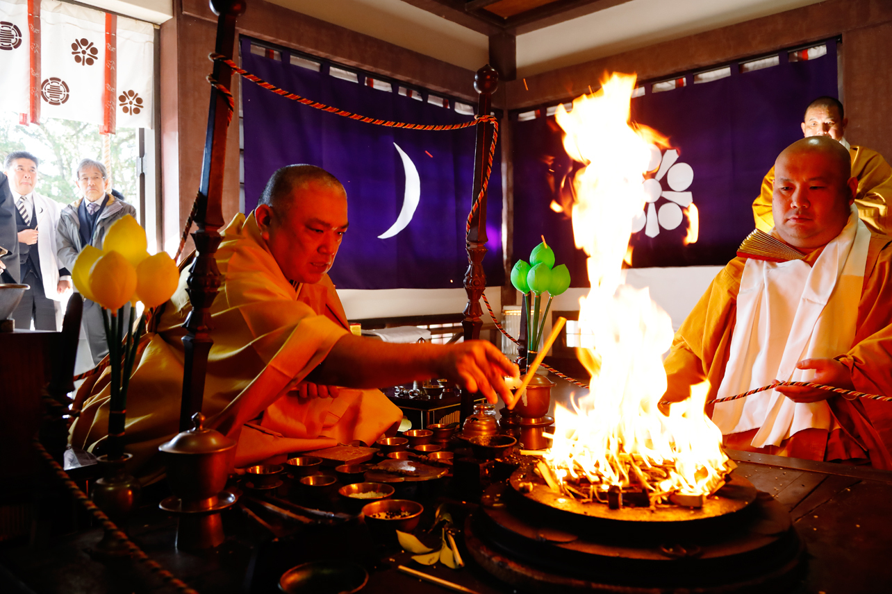 相良神社の宮司と、地域の仏教各宗派の僧侶が一堂に会し、護摩祈祷の炎が立ち上る中、