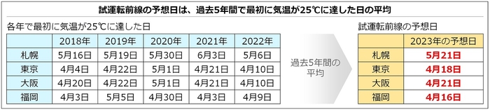 本前線に記載の予想日は、全国の各地域の過去5年間において、各年の最高気温が25℃に達した最初の日を調査し、それらを平均した日としています。
