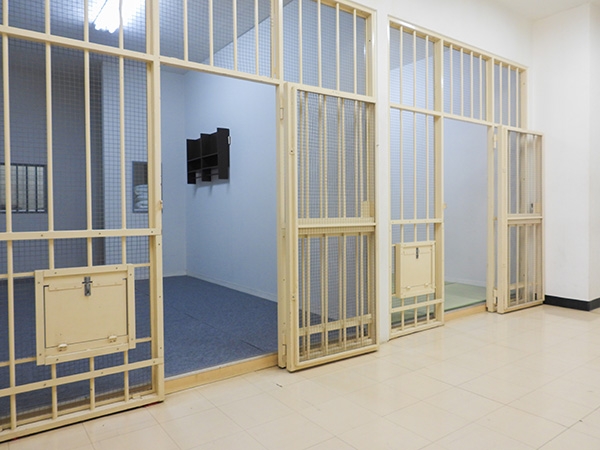 裁判所を再現した法廷セットでは、移動可能な全18席の傍聴席やテレビモニターと卓上マイクをご用意。法服の貸し出しもございますので急な撮影や急を要する事件の再現などにも対応が可能です。留置場は2部屋あり、鉄格子には配膳や物の受け渡しに使用する食器口、取り外し可能な金網や洗面台、トイレ、備品として和布団一式も取り揃えており、細かい描写、シチュエーションに対応が可能となっています。刑事ドラマには欠かせない取調室、面会室も合わせてご利用いただけます。留置場と面会室は窓外に通路を設けておりますので、窓側からの撮影や照明を設置することも可能です。