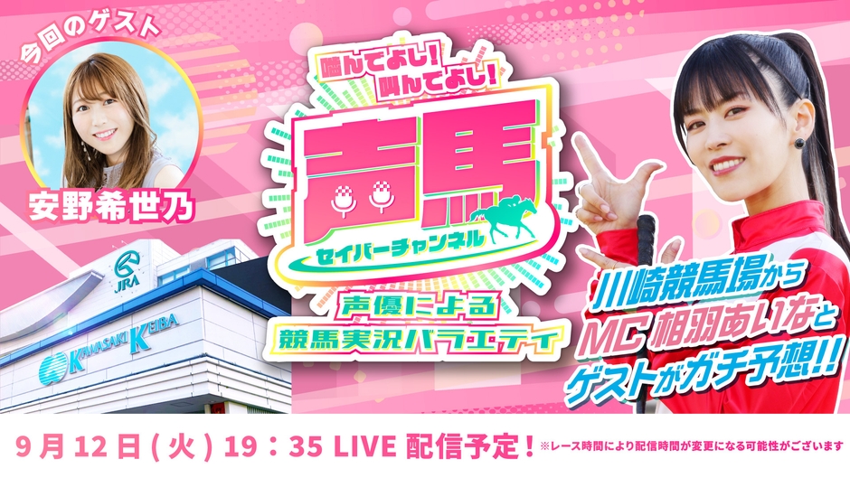 声馬チャンネル実行委員会は、声優による川崎競馬実況バラエティ番組『声馬チャンネル(セイバーチャンネル)@川崎競馬場』の第20回ライブ配信を2023年9月12日(火)に番組公式YouTubeチャンネルにて配信いたします。