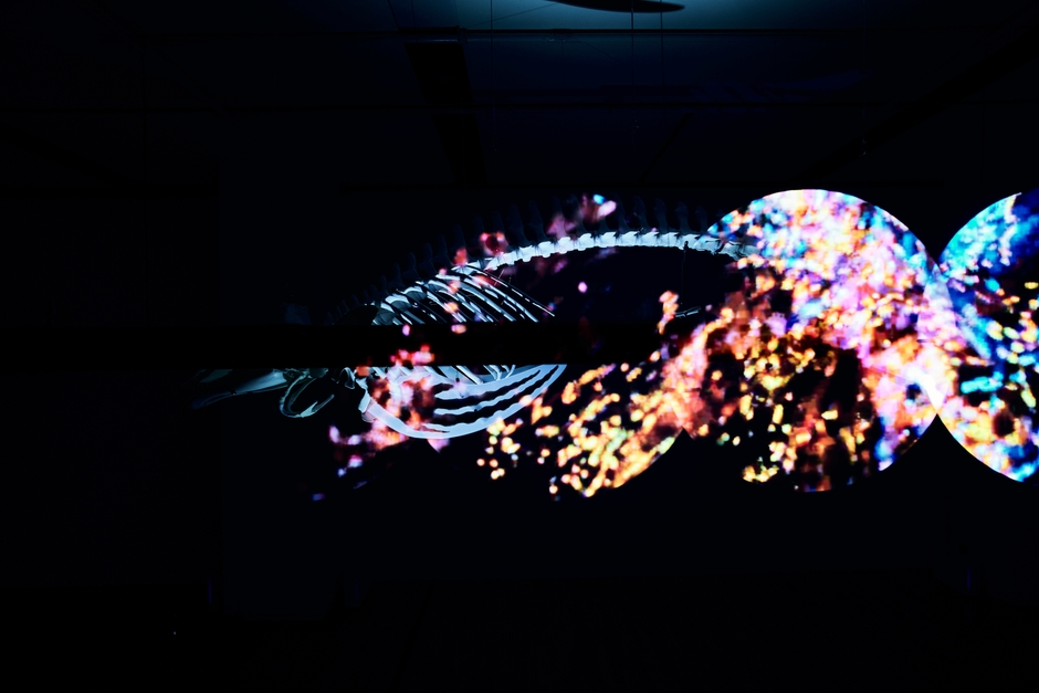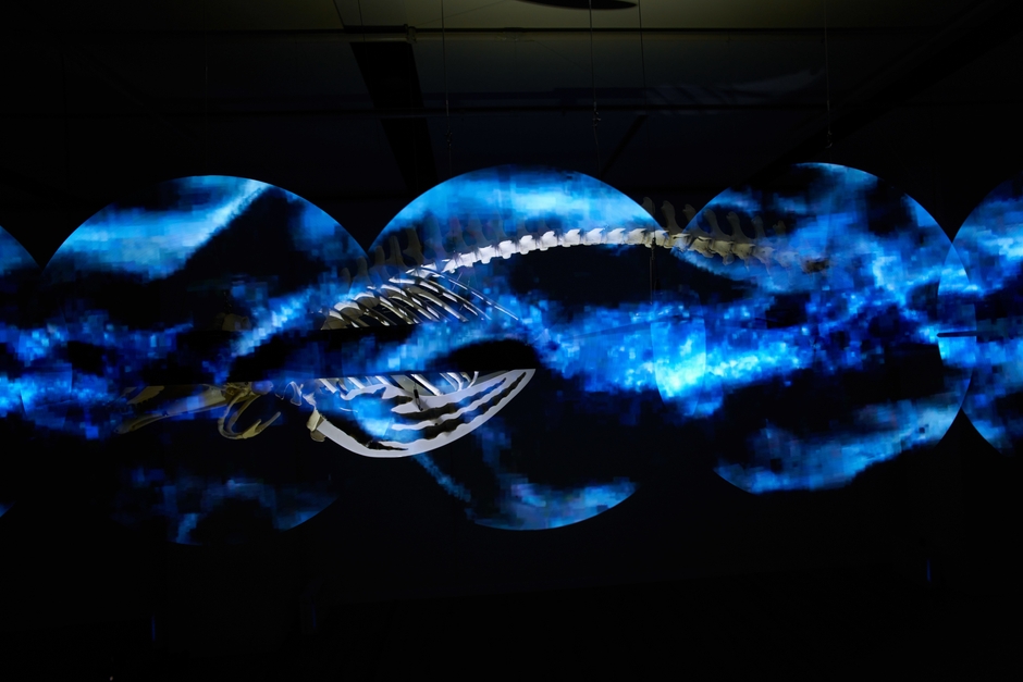 コビレゴンドウの骨を眺めながら,観念的な情報の海と死後の世界について考えている.朧げな記憶,光と闇,生と死,物質と生命,環世界の始まりと終わりの間.計算機自然,それは質量ある自然と質量のない自然が融合した新しい自然.そこにあるのは生きているものと死んでいるものが等価に存在する世界なのかもしれない.産まれ出る姿はデジタルでもアナログでも可能なのかもしれない.そして死は身体喪失と直接的な等価関係ではなくなるかもしれない.そんな環世界をイメージしながらコビレゴンドウを通じて描いた.