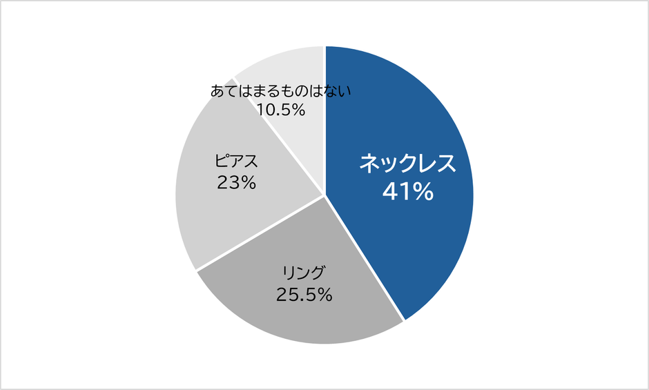 「春の新生活ギフトとしてリング・ネックレス・ピアスのうち、どれを貰ったら嬉しいですか?」というアンケートに対し、「ネックレス」41%、「リング」25.5%、「ピアス」23%、「あてはまるものはない」10.5%という、ネックレスが大半を占める結果となりました。