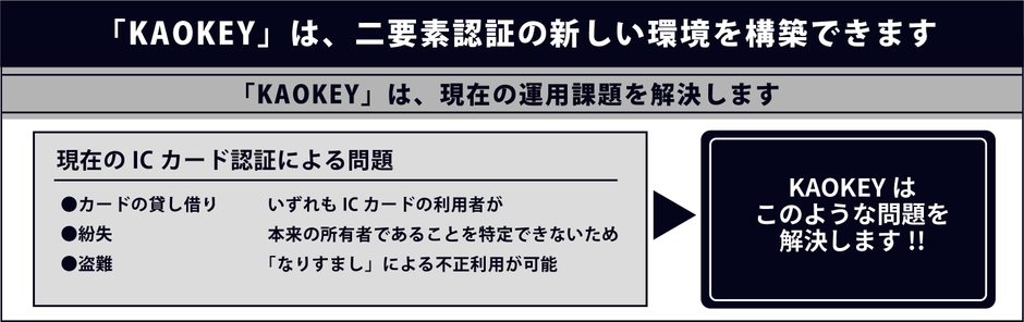 「KAOKEY」は、セキュリティとして必要とされる二要素認証環境(顔認証+ICカード認証)を構築できる開発キットです。これまでは、認証サーバーを構築してオンライン環境での運用が必須でしたが、「KAOKEY」はオフライン環境での運用を可能とし、スモールスタートで導入を行うことができます。