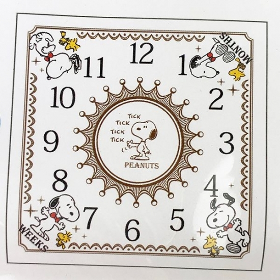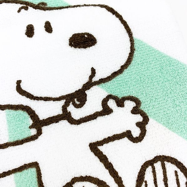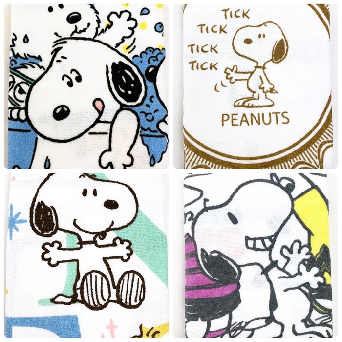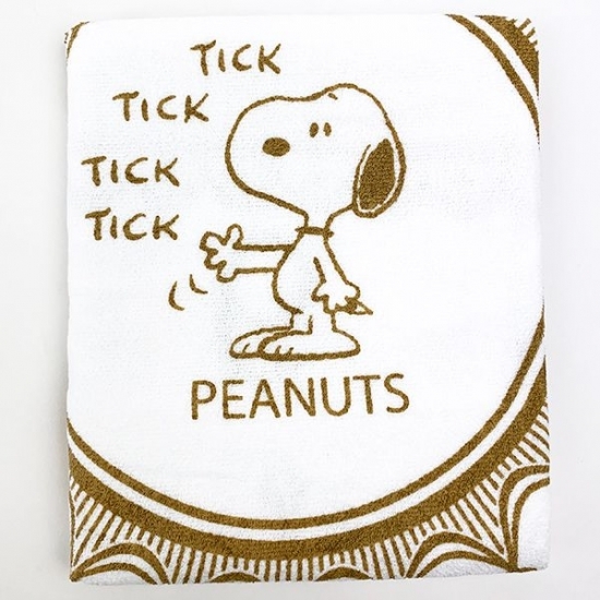 続いては、時計がモチーフの湯上りタオルです。時計の針のようなアクションのスヌーピーがセンターに描かれていますね♪