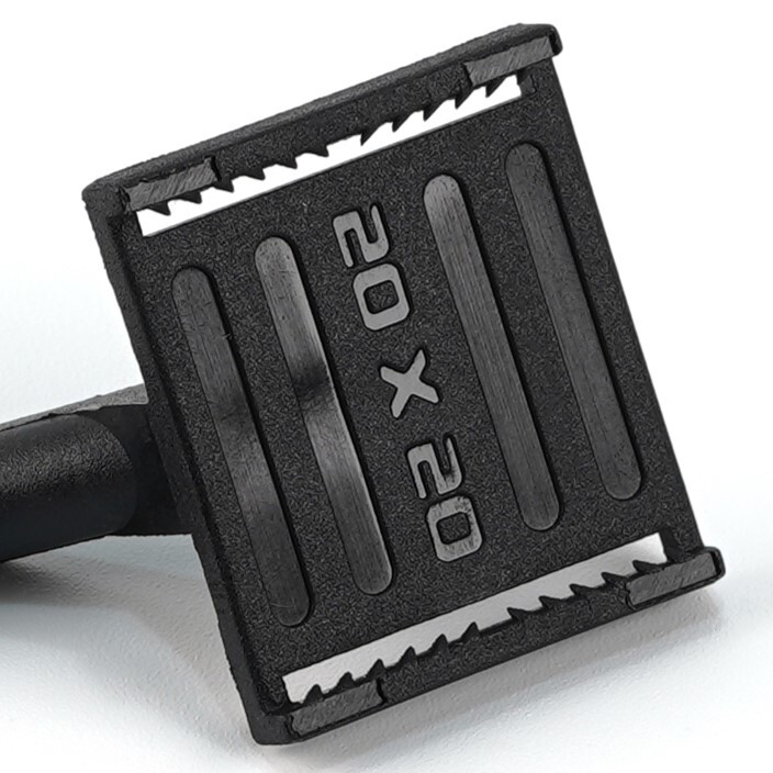 - 左右の刃と取付け面の凹凸が、スポンジヤスリを5,000ストローク/毎秒の激しいストロークでもずれないように固定。特殊形状、日本・台湾・ドイツにて実用新案取得済。
