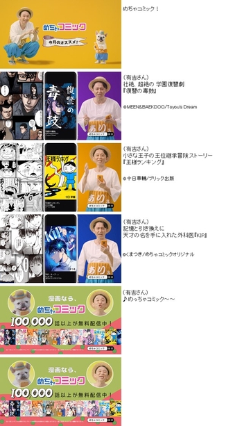 株式会社アムタス(東京都渋谷区 代表取締役社長 山下正樹)の提供する電子コミック配信サービス「めちゃコミック(めちゃコミ)」は、有吉弘行さんを起用した新TVCM 「有吉さんと遭遇篇」「今月のオススメ 有吉さん篇」を2020年12月25日(金)より放送開始いたします。