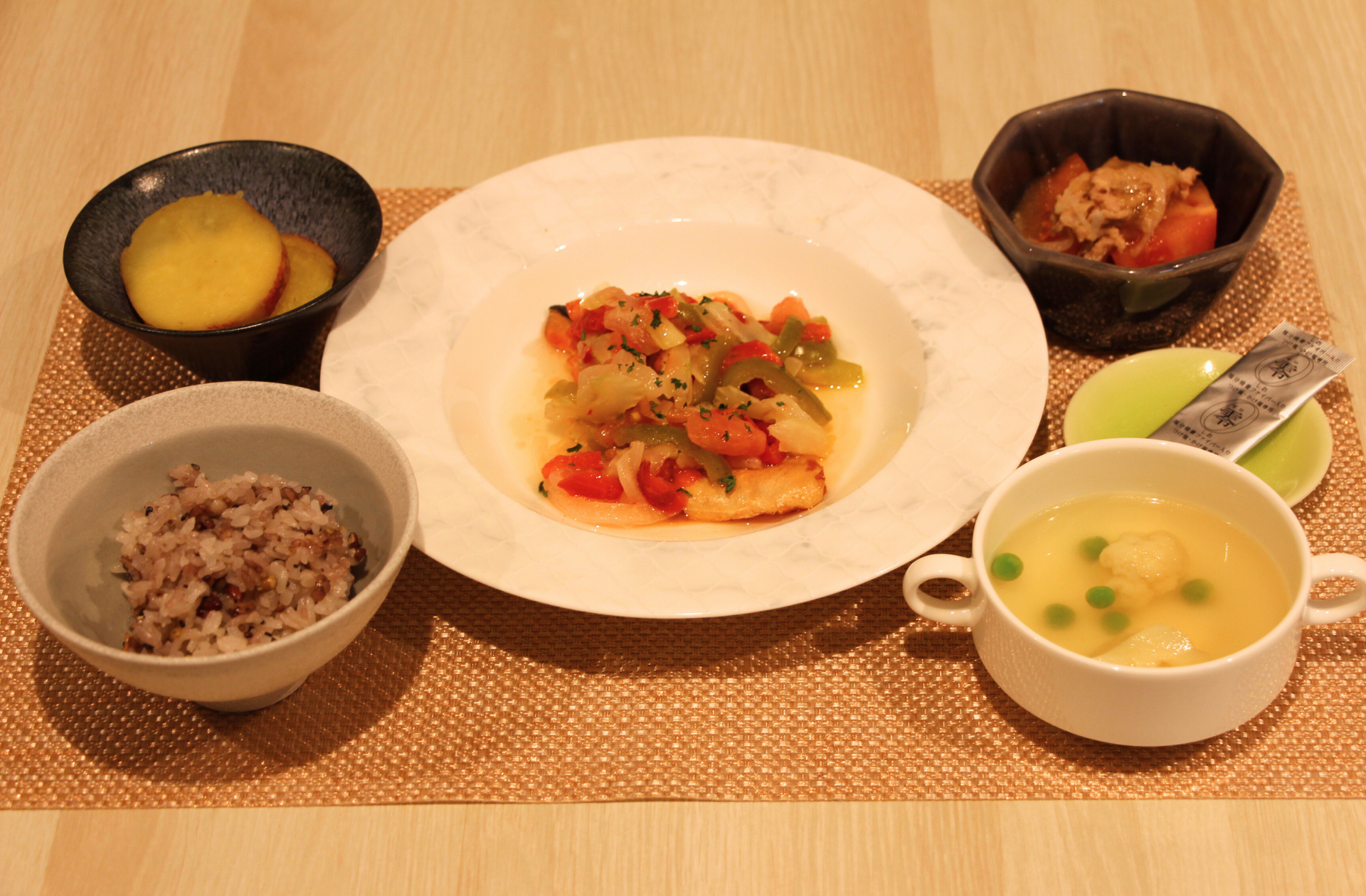 夕食時には、グリーンハウスが考案した「身体思いの彩り御膳」を提供。メインの「魚のラビゴットソース」は、酢の酸味を活かして塩分控えめに仕上げられており、そこに海藻由来の食物繊維が入った当社の「零しお」を、入居者様ご自身でお好みの量ふりかけてお召し上がりいただくスタイルを採用しました。これにより、美味しさを損なわずに塩分をコントロールする「塩分オフセットメニュー」を体験いただきました。
