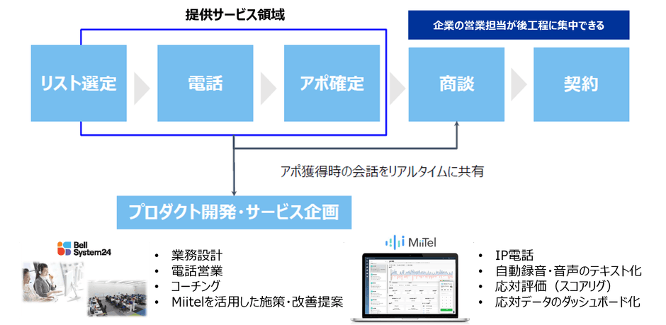 そのような課題を解決するため、インサイドセールスでの新規開拓における電話営業の運用ノウハウを数多く持つベルシステム24と、AIにより自動的に電話営業でのすべての音声をテキスト化し分析できるIP電話の「Miitel」を提供するRevCommが共同で、新たにデータ活用型「インサイドセールス代行サービス」の開発に至りました。