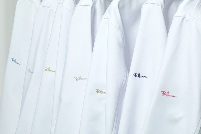 今回初めて、白衣の左肩に施されるRon Hermanロゴ刺繍の色を選べる仕様が登場。これまでの定番ネイビーに加え、カリフォルニアの空や光からインスピレーションを受けた6つを新たに追加し、全7色からお選びいただけます。