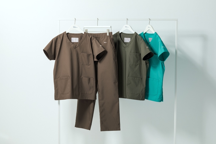 今回登場するのは、スクラブに加わった新色(アクア/ブラウン/カーキ)と、白衣のロゴ刺繍カラーを全7色から選べる新仕様モデル。