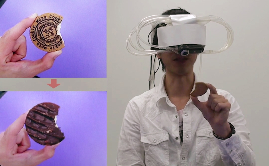 VRを使い、より科学的にクロスモーダル知覚を発展させた研究が、鳴海准教授の「メタクッキー」です。ヘッドマウントディスプレー(HMD)を装着してプレーン味のクッキーを食べます。その際、HMD上にチョコレート味やイチゴ味のクッキーを表示し、同時にチョコレートやイチゴの匂いを出すとクッキーの味もチョコレート味、イチゴ味として受け取ってしまいます。約7割の人が狙った通りの味として受け取ることが実証されています。味覚に視覚や嗅覚が与える影響の大きさが分かります。