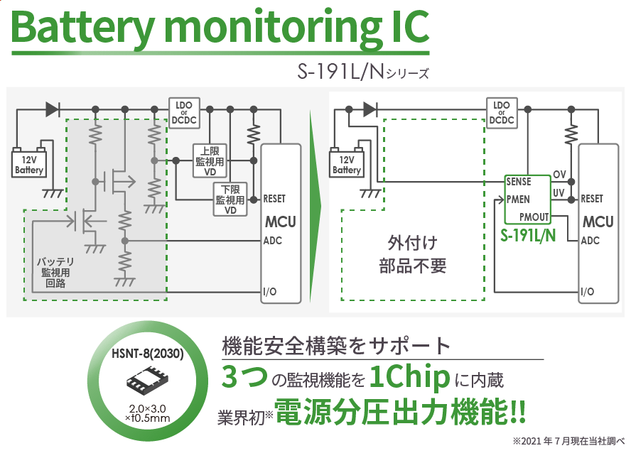 本日発売したバッテリーモニタリングIC「S-191L/Nシリーズ」は、安全性確保に求められるECUの機能の中で電圧を監視する為のICです。