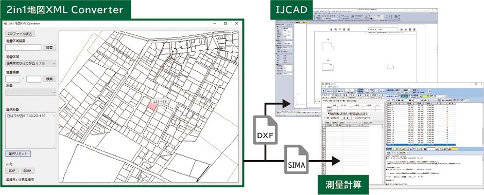 「地図データコンバーター」は、XMLデータをDXF形式やSIMA形式に変換が可能です。これにより、G空間情報センターより無償提供される、全国の法務省登記所備付地図データを2in1で活用できます。
