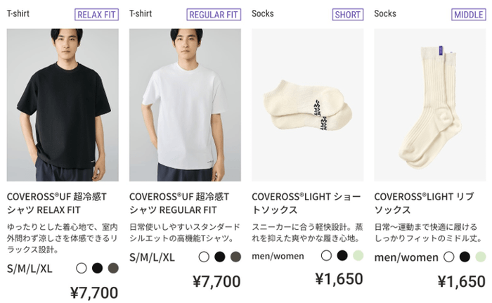 「24時間アクティベートウェア」シリーズは、全てこのCOVEROSS(カバロス)の素材を使用しており、“24時間、全てを快適に変える“をコンセプトに、男女兼用アイテムとしてセットアップをはじめとした全8型をラインアップしております。